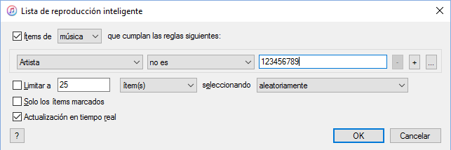 - Crea una lista de reproducción inteligente (Ctrl + Alt + N) llamada "All files" con la siguiente regla: “Artista” no es “123456789” (o cualquier nombre sin sentido que estés seguro que no existe en tu biblioteca).