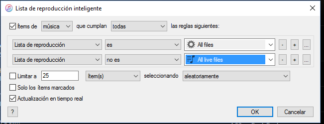 - Crea una lista de reproducción inteligente llamada "Missing files" con las siguientes reglas: Lista de reproducción es All files, lista de reproducción no es All live files.