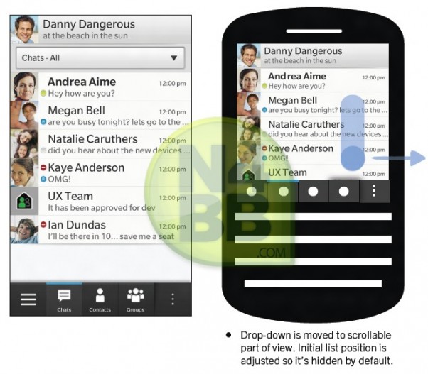 En esta ocasión N4BB nos ha mostrado las primeras imágenes de lo que podía ser el BMM en el Sistema operativo Blackberry 10. Con algunos cambios notorios, como los perfiles de los usuarios con una barra de navegación que permite alternar ente las actualizaciones del mismo, sus aplicaciones y su código de barras; un teclado para los dispositivos con pantalla táctil y botones en la parte inferior en lugar de una lista con sus funciones como se maneja actualmente.